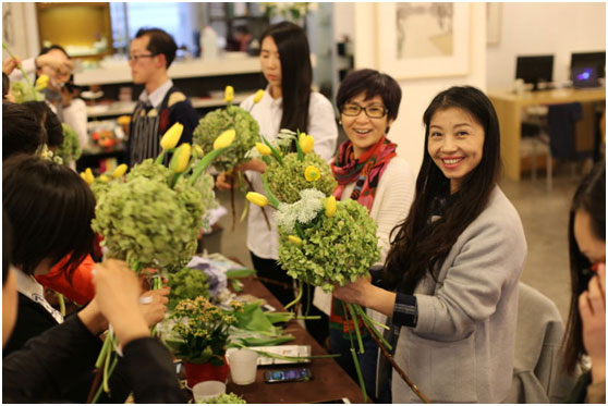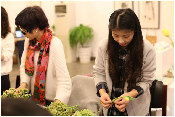 進入實際動手階段,花藝老師解析演繹著插花的每一個細節(jié),我們的女總裁們認真聆聽,不時提出疑問。