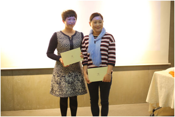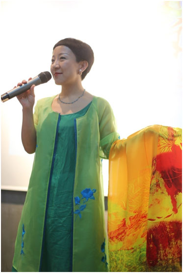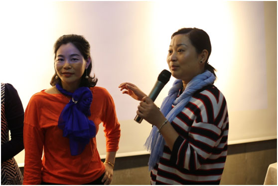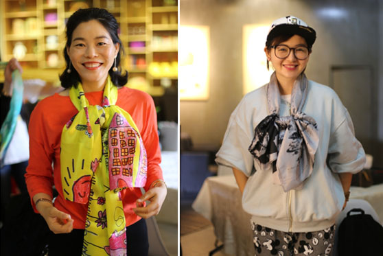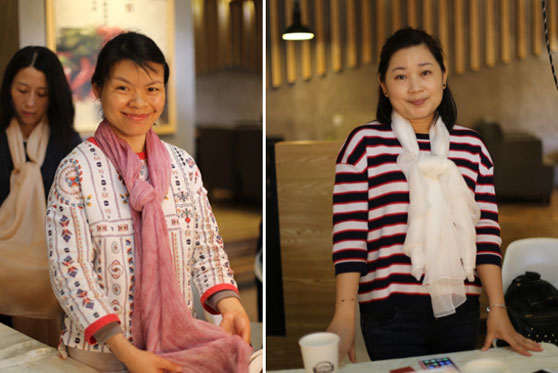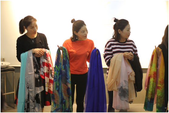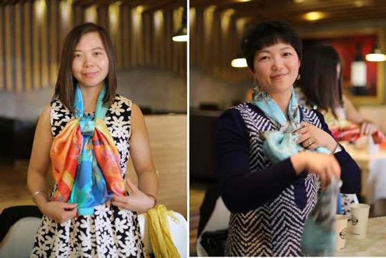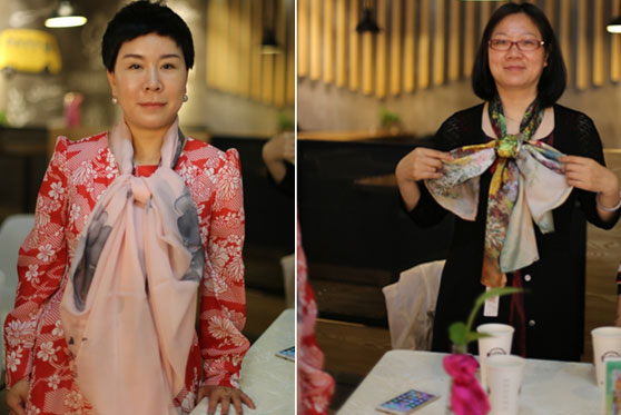(上圖恭喜贏得競(jìng)拍絲巾的女總裁:杭州莫妮服飾貿(mào)易有限公司總經(jīng)理王真真(右一)和南京蘇仕居電子商務(wù)有限公司總經(jīng)理周菁(左一)