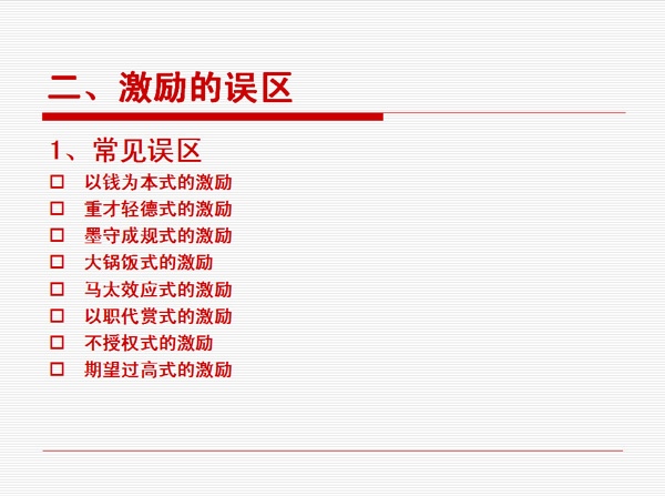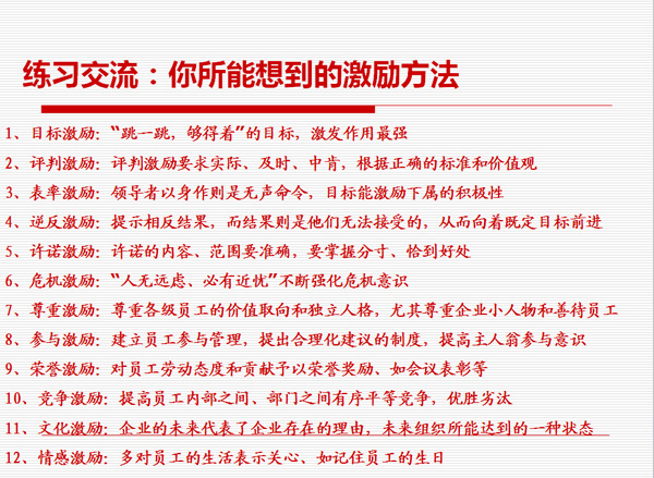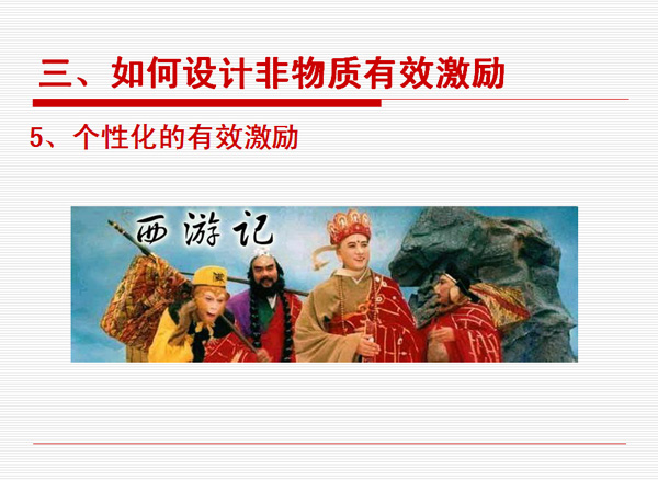 非物質(zhì)有效激勵很多人的第一反應(yīng)是不花錢,實(shí)際上世界上不花錢的東西是不存在的。而花同樣的錢辦不同的事,這是可以存在的。拿同樣的錢去產(chǎn)生不同的效益,這才是我們管理者應(yīng)該去思考的問題。