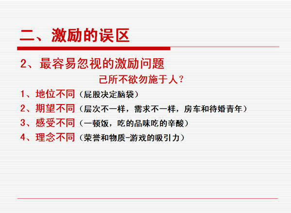 期望過高式的激勵——個(gè)人訴求不一樣的時(shí)候就必須考慮為什么己所不欲勿施于人。