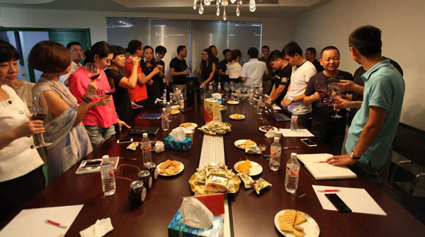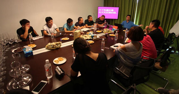 (會(huì)員們?cè)谄愤^(guò)45度冰濃郁的酒香中,集思廣益,暢所欲言,交流分享自己的建議)