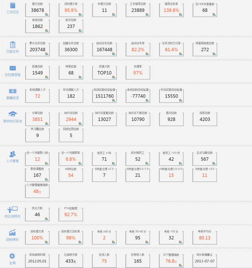 本模塊通過科學的統(tǒng)計方法,收集公司GTT使用的相關數(shù)據(jù)進行分析,并給出詳細直觀統(tǒng)計報表,讓企業(yè)主能更加清楚、明了地知道自己公司在管理效能和GTT使用效能上的提升,從而對自己公司的管理水平有個更加客觀的評價。